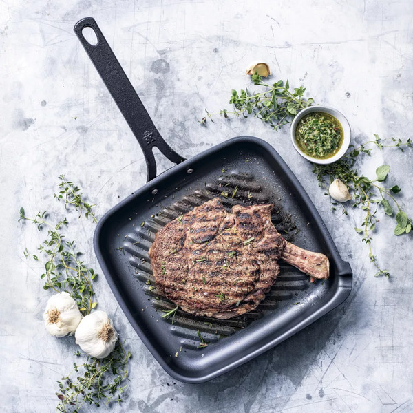Chảo thiết kế hình vuông, trên bề mặt có các vân nướng.