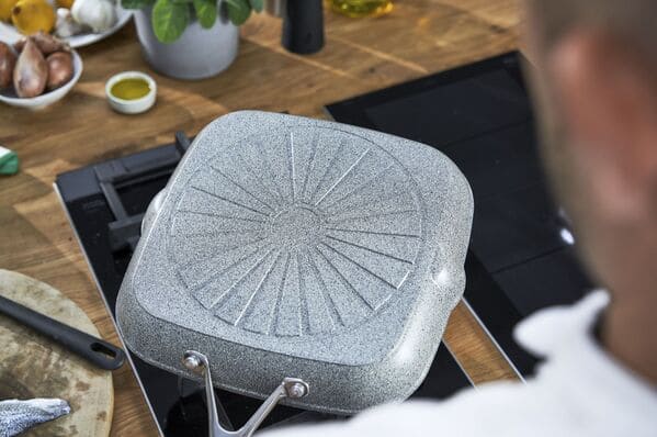 Chảo hình vuông, thiết kế vân đá Granit, bề mặt có vân nướng, phù hợp các món nướng cùng khả năng chịu nhiệt từ -20 độ C - 230 độ C. Đáy chảo tích hợp công nghệ cảm ứng từ và được gia cố bằng các hạt khoáng phù hợp sử dụng trên mọi loại bếp.