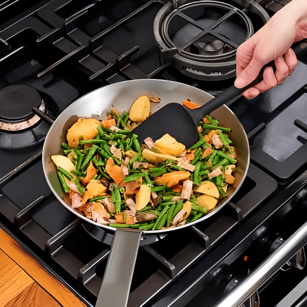 Bề mặt rãnh có thiết kế đặc biệt với 3 khe hở giúp món chiên xào ráo dầu mỗi khi lật đảo hoặc vớt ra khỏi chảo chiên.