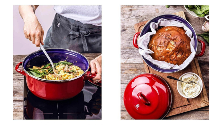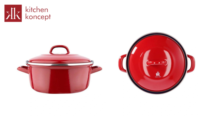 Nồi tráng men BK Indigo màu đỏ, chất liệu thép carbon, trọng lượng nhẹ, lõi cacbon truyền và giữ nhiệt lâu.