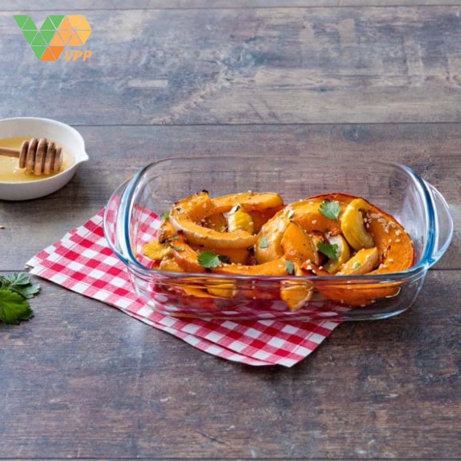 Khay được chế tác từ chất liệu gốm thủy tinh cao cấp không chỉ bền bỉ mà còn đảm bảo sự an toàn cho sức khỏe cho người tiêu dùng. Chất liệu gốm thuỷ tinh trong suốt giúp dễ dàng quan sát bánh và giúp khay có khả năng chịu được nhiệt độ cao mà không bị nứt vỡ, phù hợp cho các món bánh nướng cần nhiệt độ cao.