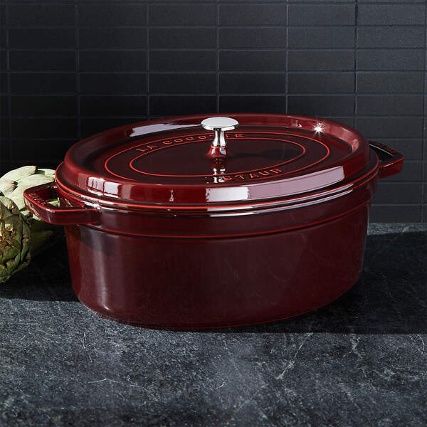 Nồi gang hình oval màu lựu đỏ là sản phẩm của thương hiệu STAUB đến từ Pháp.